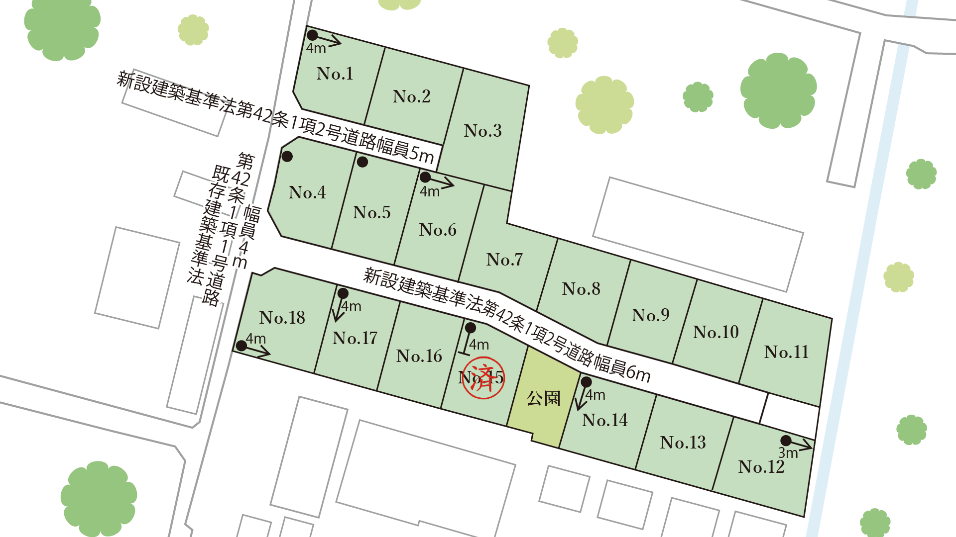 | 接道 | 新設建築基準法第42条1項2号道路幅員5m~6m、既存建築基準法第42条1項1号道路幅員4m |